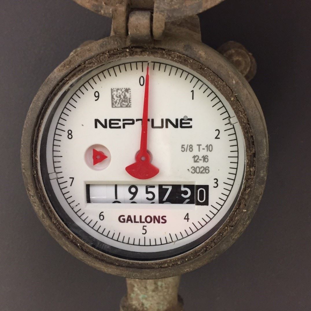 STEP 2 Once you open the meter box lid, lift the protective cap on the meter. On the face of the meter, there is a large dial and a display of numbers. For the residential meter, each rotation of the dial measures 10 gallons. Read the number display from left to right. Be sure to include the stationary zero. This is your meter reading. Meters measure water in gallons or cubic feet. Charges for the amount of water consumed are rounded to the nearest thousand gallons or hundred cubic feet used during a billing period. Compare that reading to what your bill states as your current or present reading.